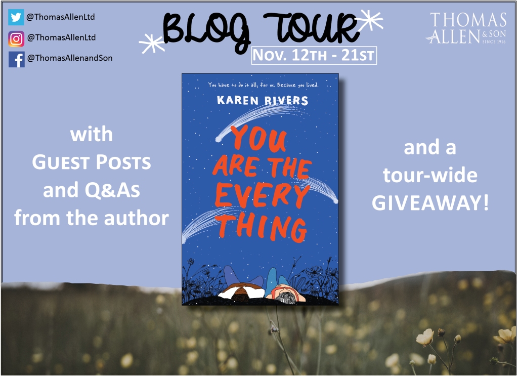 Welcome to one of the stops on the Thomas Allen & Son blog tour for You Are the Everything, a new young adult novel from award-winning Canadian author Karen Rivers. Please read on for my thoughts, a very special guest post from Karen herself, as well as link to a tour-wide giveaway for Canadian residents. I’ll put up the blog tour postcard on the bottom of the post so you can check out what other participants of the tour have written and posted. Enjoy!